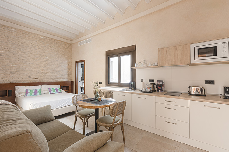 Como en el resto de apartamentos, encontrarás detalles de la construcción original que hemos recuperado para vivir de cerca la historia de Sevilla. Siéntete libre de viajar a otra época mientras disfrutas de las comodidades de hoy.